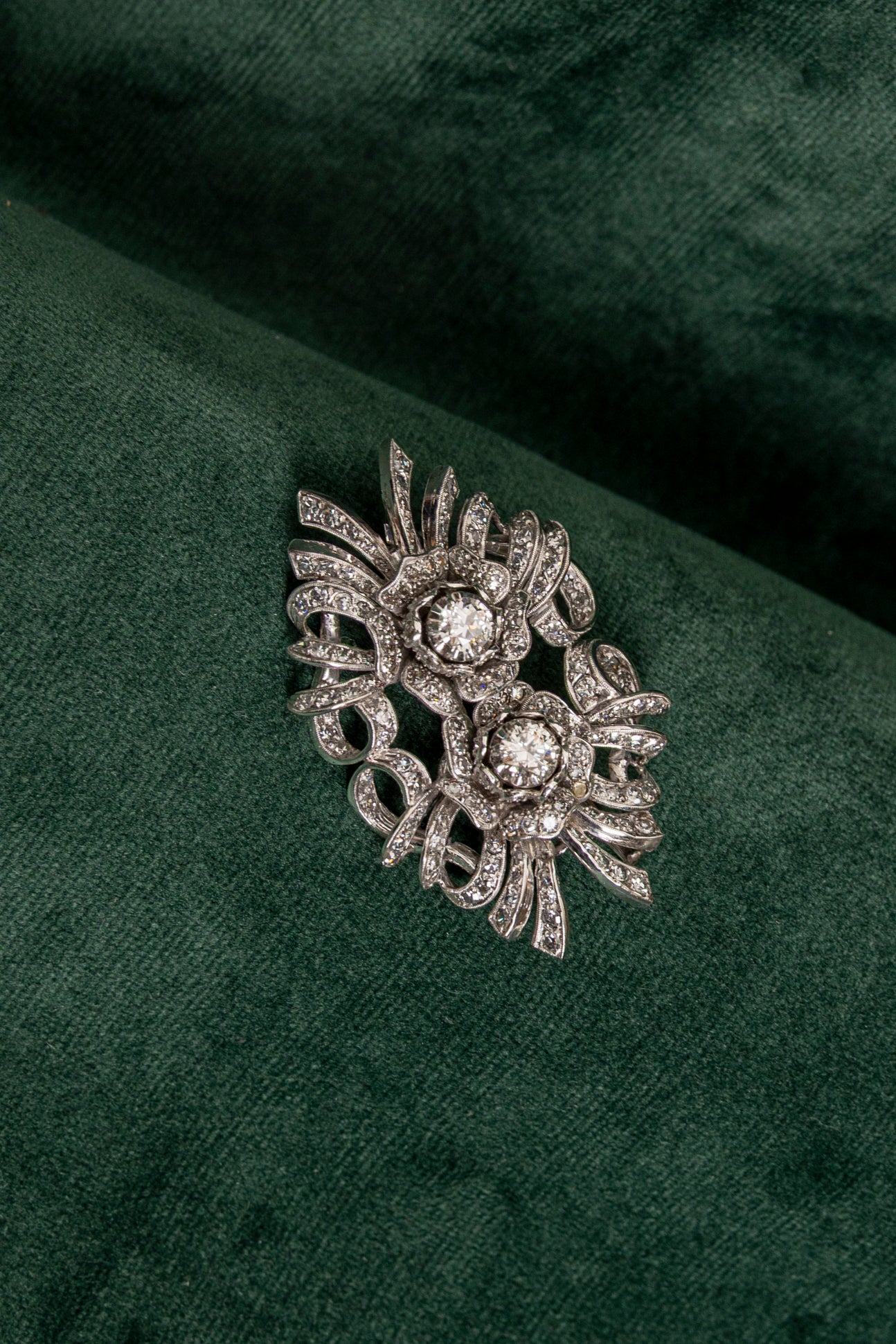 Broche Vintage estilo Rosetón de Diamantes en oro Blanco 18k, 2 Diamantes Naturales talla Antigua con peso total esti...