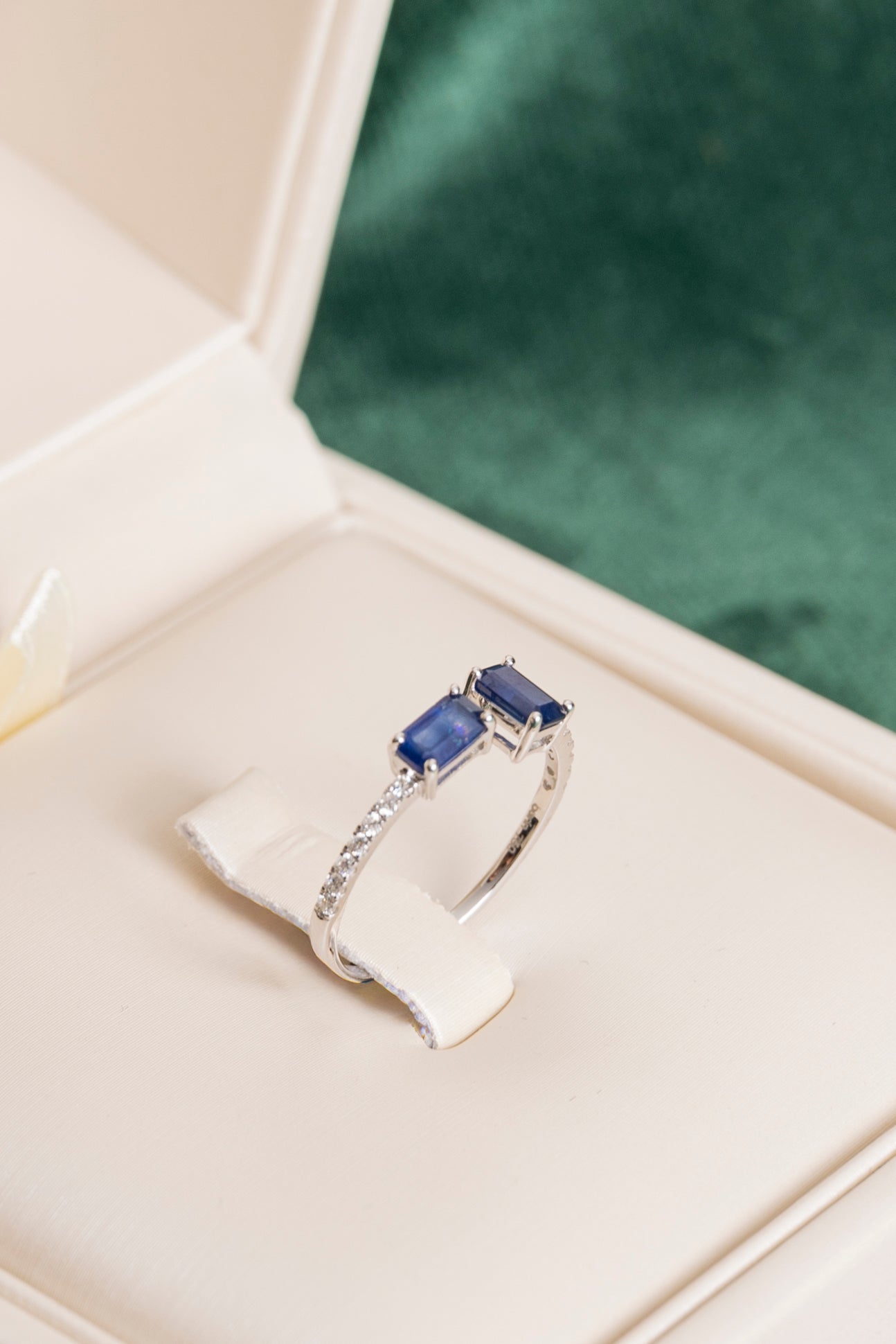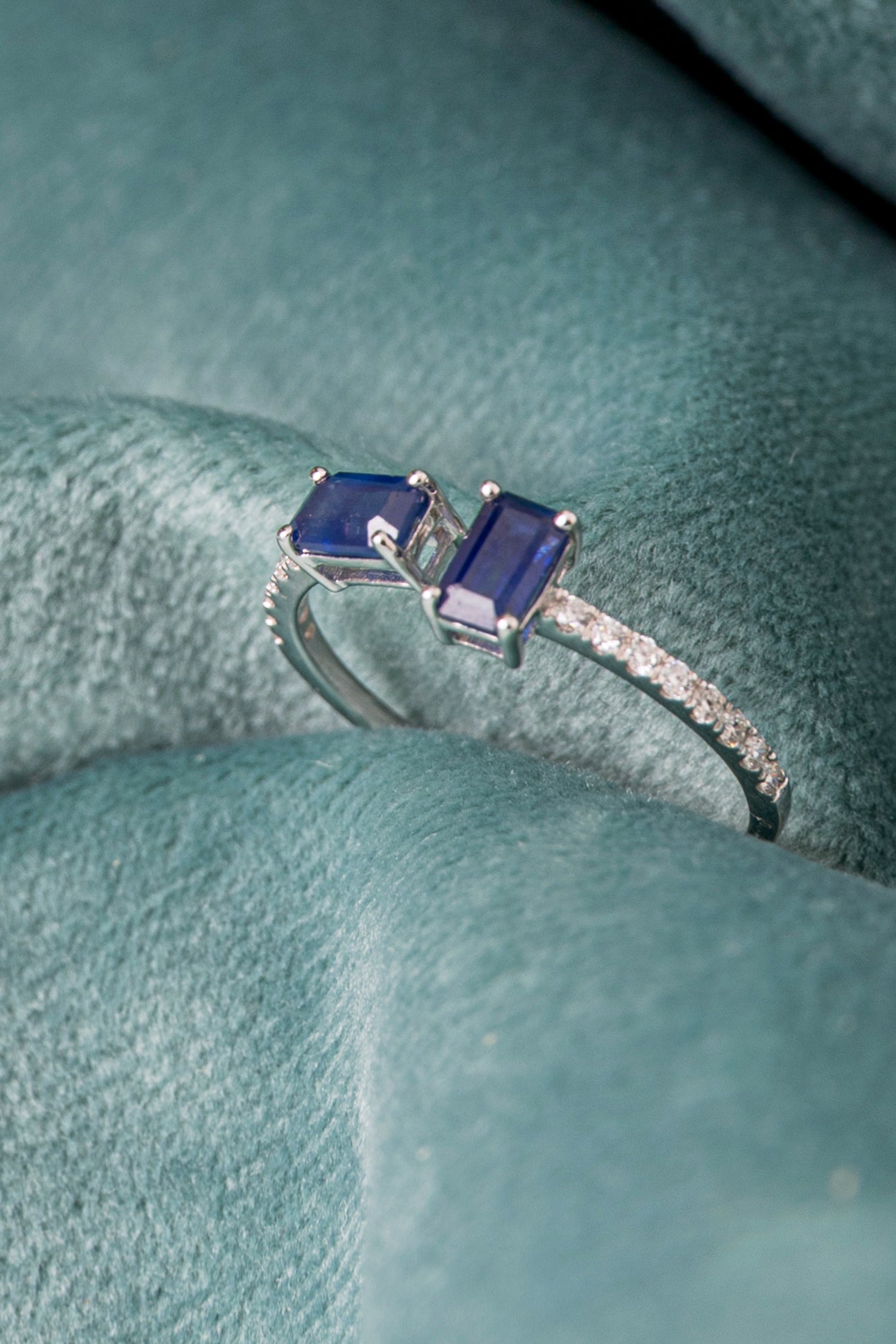Modern To and Me style ring with sapphires and diamonds in 18k white gold, 2 Natural Sapphires with an estimated t...