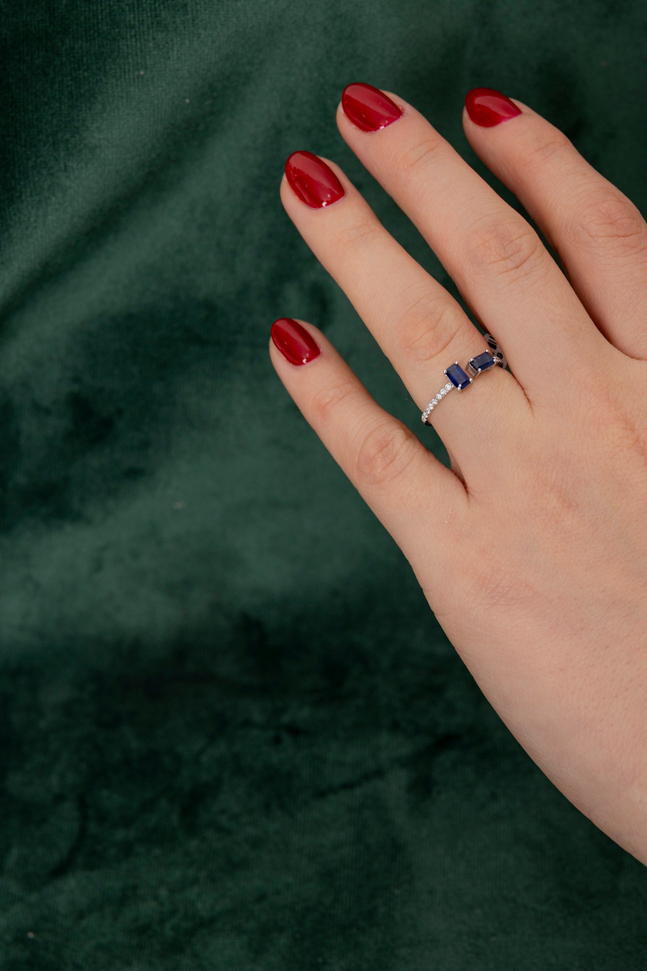 Modern To and Me style ring with sapphires and diamonds in 18k white gold,