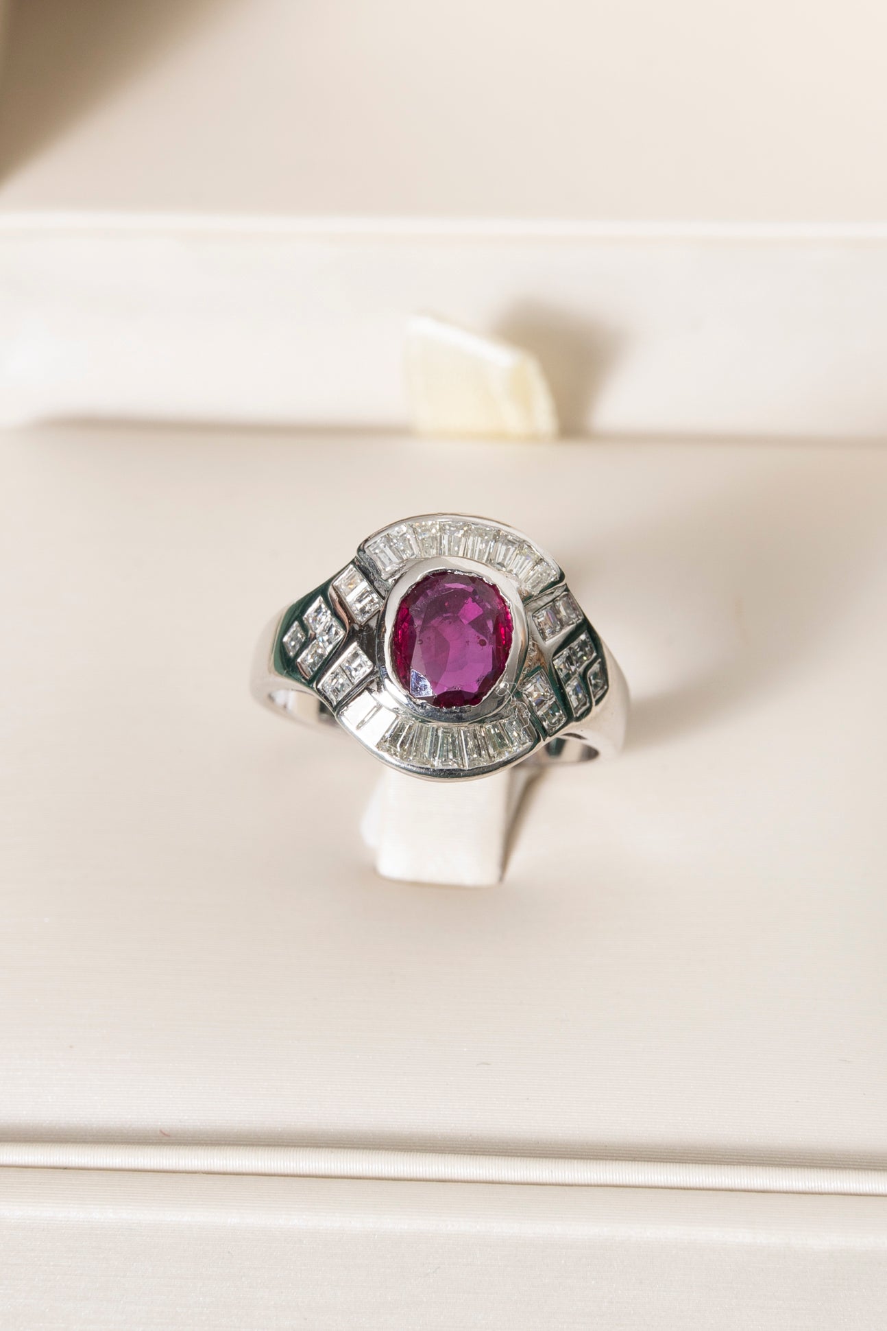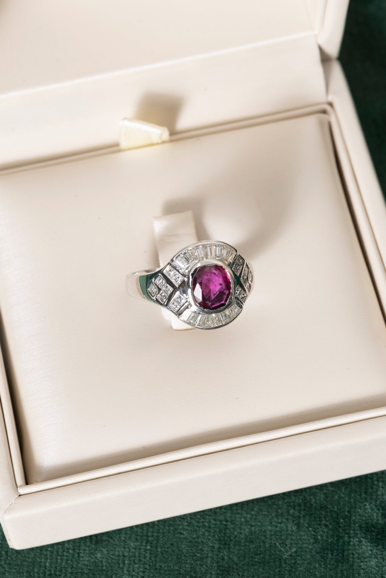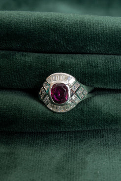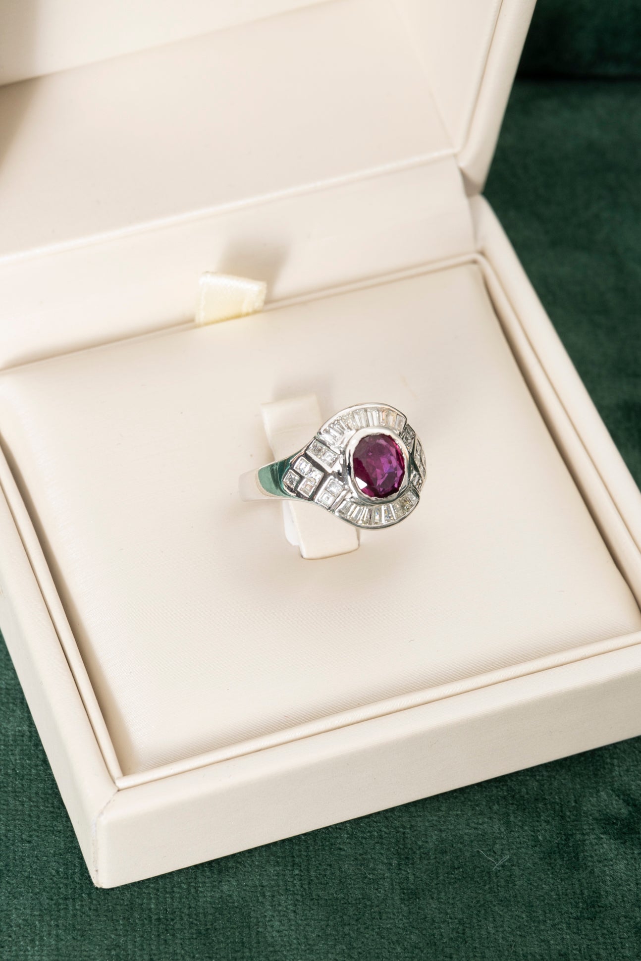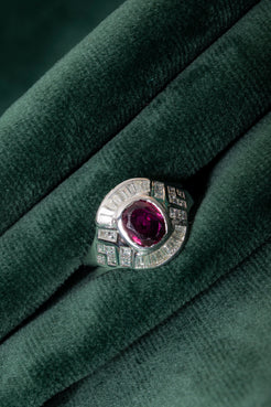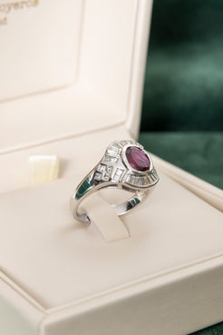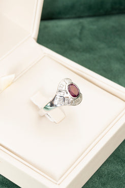 Sortija Vintage estilo Sello de Rubí y Diamantes en Oro Blanco 18k,