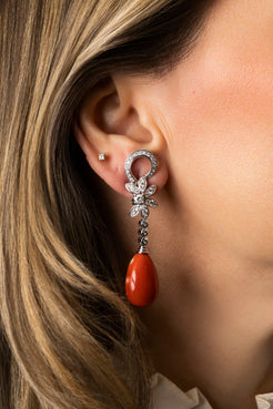 Pendientes Vintage largos de Diamantes y Coral en Oro Blanco 18k,